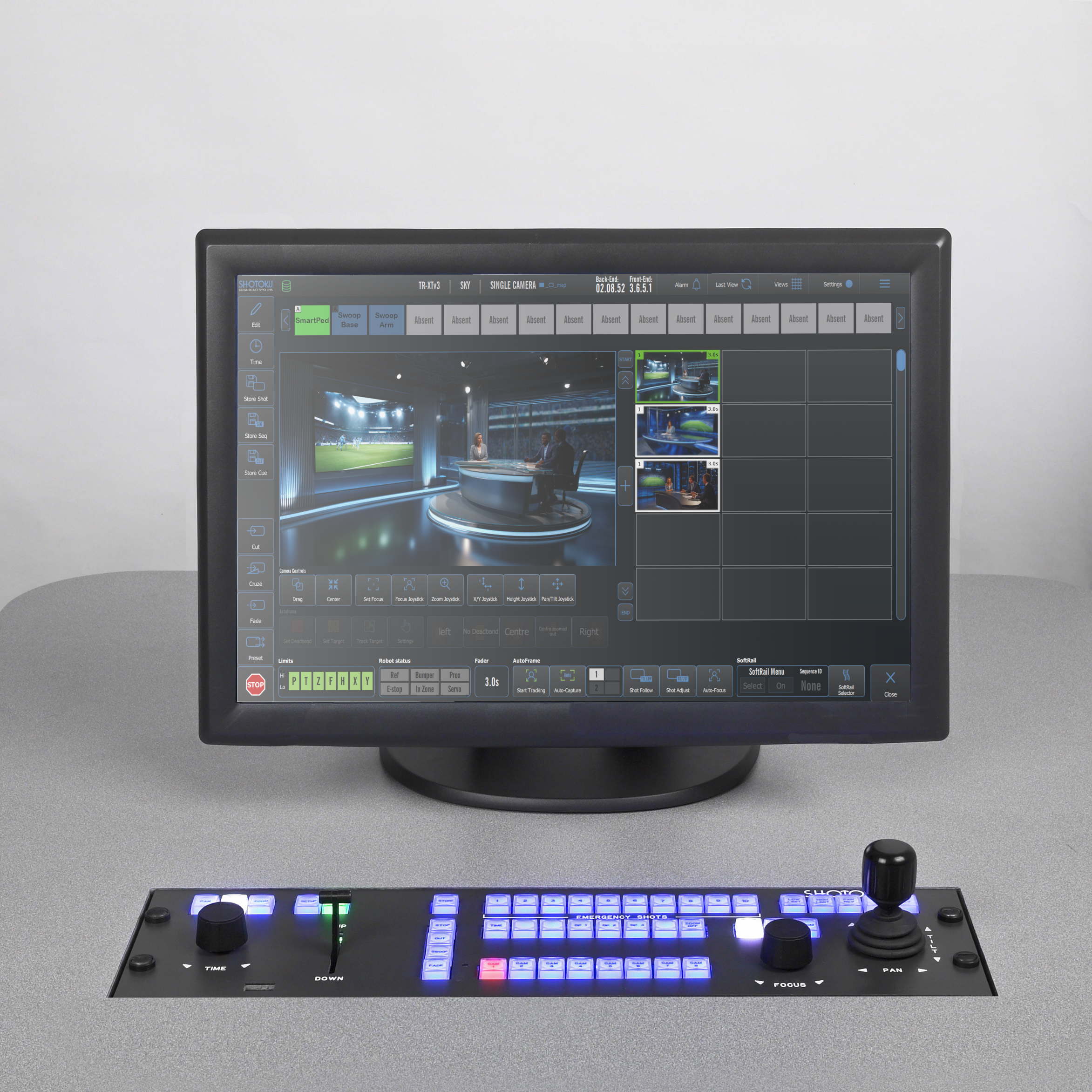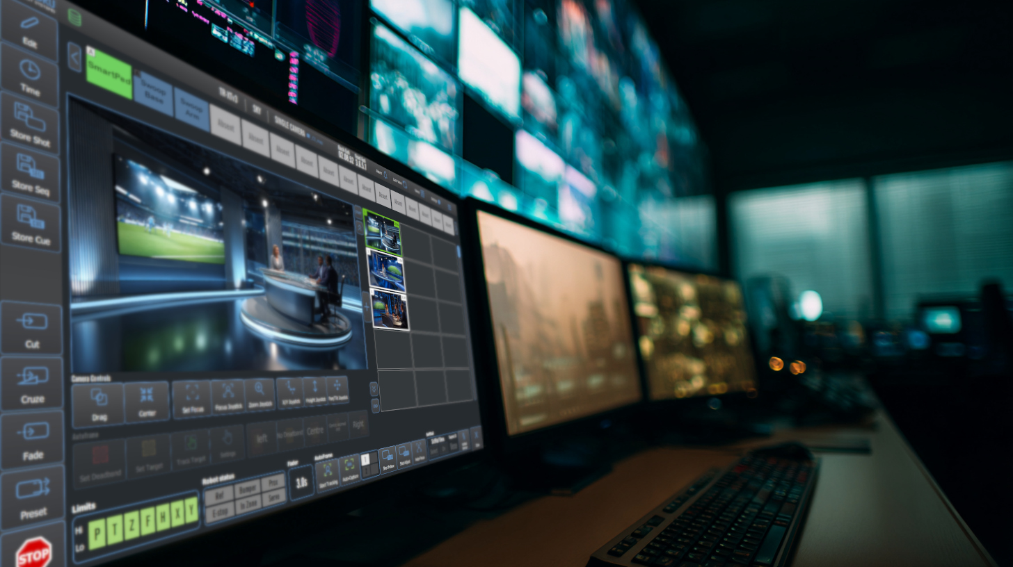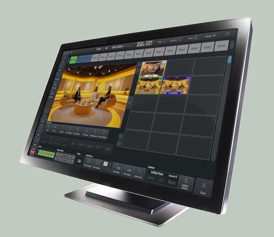 The very latest fully updated TR-XT is an extremely powerful, fully-featured remote camera control system. Despite its power and sophistication it is incredibly simple to operate – something vitally important in any broadcast or live-TV environment. A virtually unlimited number of shots may be stored for each camera since they are held on the hard drive of the T-Computer – the heart of the TR-XT camera control system. Shots are stored with a thumbnail image captured in SDI, NDI and (coming soon) SMPTE-2110 directly from the controlled camera. Shots may be displayed in random mode, where camera shots are stored in any grid position or organised in columns by camera number. For systems with SmartPed fully robotic pedestals or SmartRail rail cameras, the powerful StudioView mode shows the position and status of all cameras in the studio, as well as location of the next shot and any exclusion areas defined for the floor space.